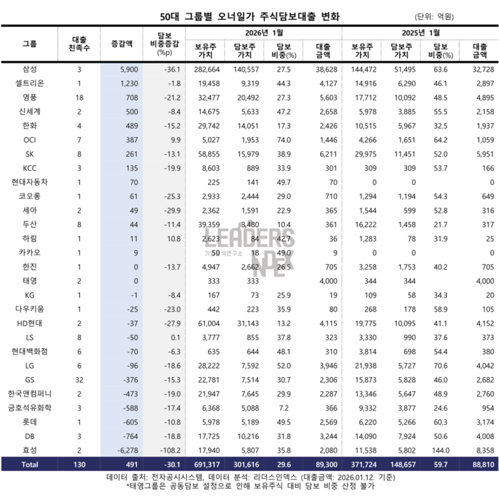 DB그룹은 4008억원에서 3244억원으로 764억원 감소했다. 롯데 역시 605억원 줄며 감소세를 기록했으며 신영자 롯데재단 이사장의 담보지분 정리 영향이 컸다.