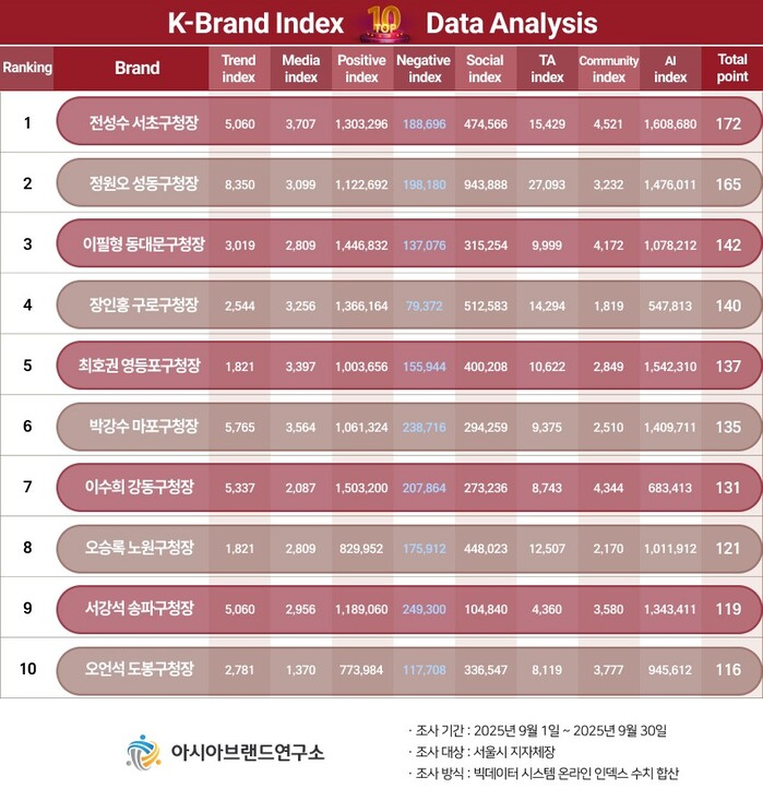 K-브랜드지수 서울시 지자체장 부문은 전성수 서초구청장이 1위를 차지했으며, 정원오 성동구청장(2위), 이필형 동대문구청장(3위), 장인홍 구로구청장(4위), 최호권 영등포구청장(5위), 박강수 마포구청장(6위), 이수희 강동구청장(7위), 오승록 노원구청장(8위), 서강석 송파구청장(9위), 오언석 도봉구청장(10위) 등이 TOP10에 이름을 올렸다.