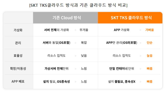 이번에 출시한 TKS클라우드 서비스는 이러한 기업 고객들의 니즈를 모두 충족하는 서비스로, 타사 유사 솔루션 대비 ‘설치없이 사용 가능, 전문인력 불필요 등 저렴한 투자비용’, ‘개발 및 서비스화 기간 단축’, ‘신속한 앱 개발 및 배포 체계 구축 가능’ 등이 강점이다.