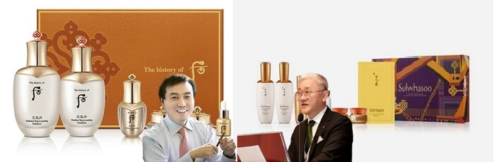 ▲사진 왼쪽부터 차석용 LG생활건강 부회장과 천기단 화현 세트, 서경배 아모레퍼시픽그룹 회장과 설화수 세트 (사진 = 양사 제공)