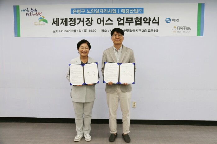 ▲ 애경산업은 지난 1일 시립은평노인종합복지관에서 은평구, 은평시니어클럽과 함께 노인 일자리를 창출하는 자원순환 사업인 ‘세제 정거장 어스’ 후원 협약을 체결했다. 협약식에서 애경산업 안정태 상무(오른쪽), 은평구 김미경 구청장(왼쪽)이 참석해 기념촬영을 하고 있다. |