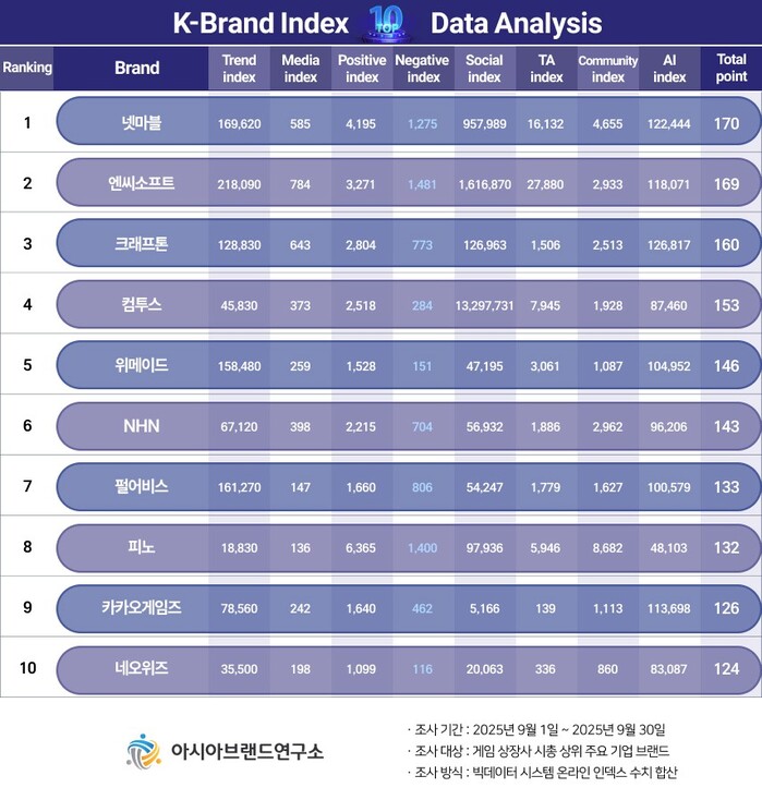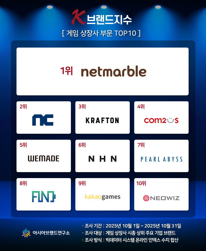 이번 K-브랜드지수 게임 상장사 부문은 게임 상장사 시총 상위 주요 기업 브랜드를 대상으로, 2025년 10월 1일부터 10월 31일까지의 온라인 빅데이터 2039만 247건을 분석하여 진행됐다.
