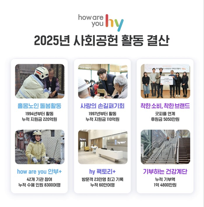 hy는 NGO 굿피플과 협력한 ‘착한 소비, 착한 브랜드’ 캠페인을 통해 약 5050만원을 기부했으며, 시민 참여형 프로그램인 ‘기부하는 건강계단’을 통해 누적 기부액 1억4800만원을 기록했다.