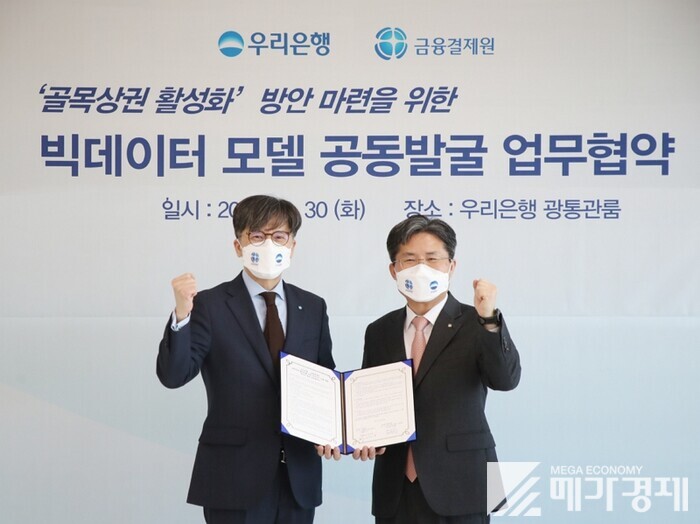 [메가경제=황동현 기자] 우리은행(은행장 권광석)은 지난 30일 금융결제원(원장 김학수)과 최근 코로나19로 인해 침체된 골목시장 자영업자 지원을 위한 “빅데이터 모델 공동발굴 업무협약(MOU)”을 체결했다고 31일 밝혔다.