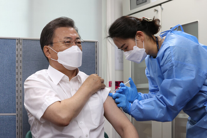 | ▲ 문재인 대통령이 23일 오전 서울 종로구보건소에서 아스트라제네카(AZ)사의 코로나19 백신을 접종하고 있다. [서울= 연합뉴스]. |