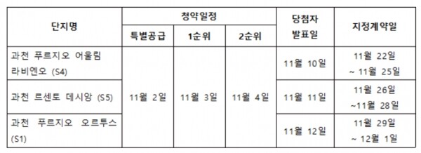 대우건설컨소시엄은 3개 단지의 동시 분양에 있어 청약일정은 동일하지만 당첨자 발표일을 달리해 중복청약 신청이 가능할 수 있도록 했으며, 총 1698세대의 일반 분양이 이뤄지면서 과천 지역 내 부동산 시장 안정에 기여할 수 있을 것으로 전망하고 있다. 각 단지별 청약일정 및 당첨자 발표일 등은 아래와 같다.