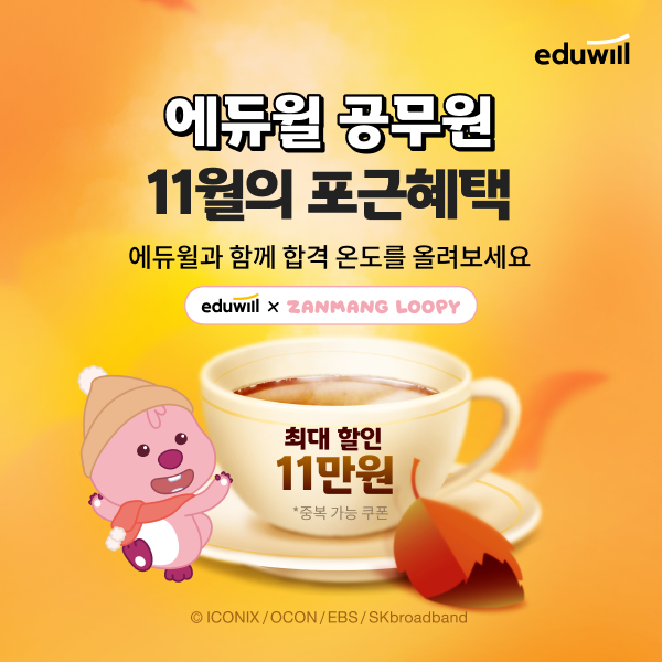 [메가경제=이상원 기자] 국민교육기업 에듀윌은 공무원 수험생을 응원하기 위해 11월 1일부터 11일까지 총 11일간 최대 11만원을 할인하는 ‘11월의 포근 혜택’ 이벤트를 진행한다고 31일 밝혔다.