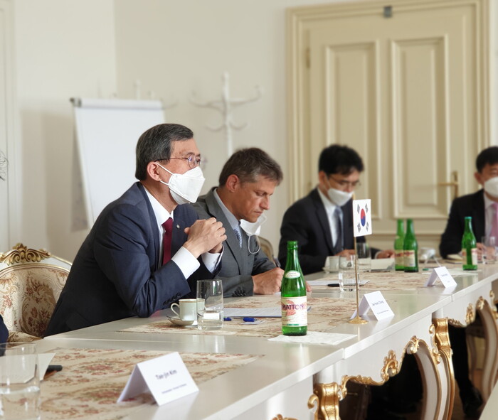 ▲ 정재훈 한수원 사장이 체코 시각으로 지난 2일 오전 체코총리 공관에서 야로슬라브 밀 원전특사를 만나 한-체코간 신규원전사업 관련 협력방안에 대해 논의하고 있다. [사진= 한국수력원자력] |