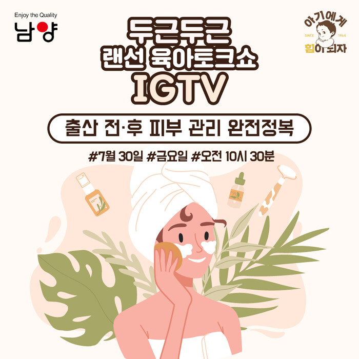 남양유업이 30일 인스타그램 IGTV 방송에서 임산부와 육아맘들을 위한 출산 전후 피부관리법을 주제로 랜선 임신육아교실을 진행한다.
