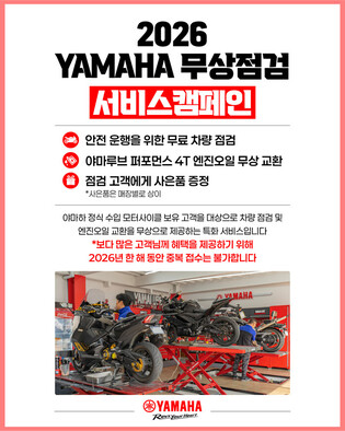 [메가경제=양대선 기자] 야마하 공식 수입원 한국모터트레이딩이 라이더들의 안전한 주행 환경 조성을 위해 ‘2026 무상점검 서비스 캠페인’을 실시한다고 5일 밝혔다. 야마하 무상점검 서비스 캠페인은 공식 수입된 야마하 차량을 대상으로 진행되며, 현장을 방문한 고객에게는 전문 테크니션의 체계적인 바이크 컨디션 체크, 야마하 순정 엔진오일 ‘야마루브 퍼포먼스
