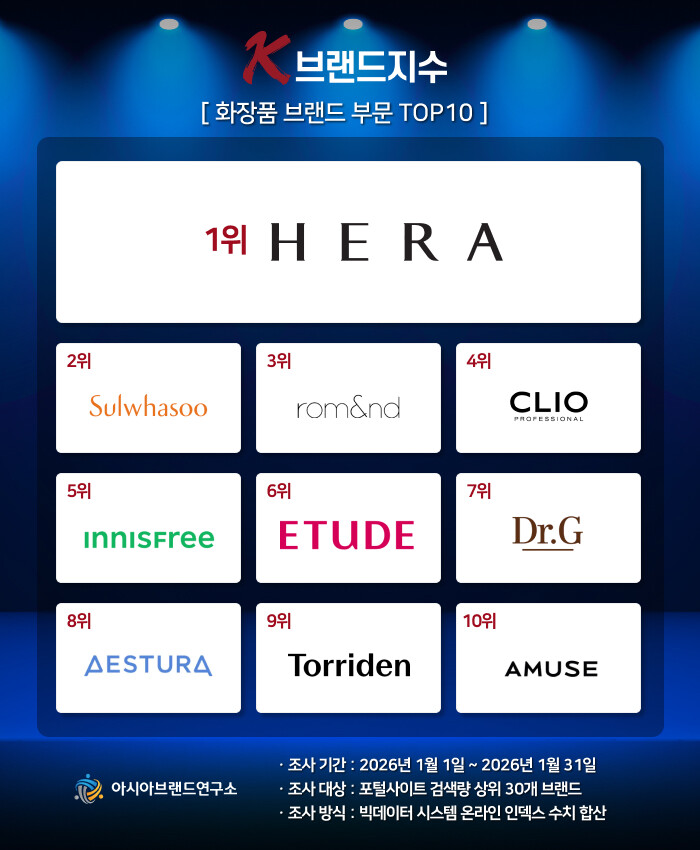 K-브랜드지수 화장품 브랜드 부문은 헤라가 또 다시 1위를 차지했으며, 설화수(2위), 롬앤(3위), 클리오(4위), 이니스프리(5위), 에뛰드(6위), 닥터지(7위), 에스트라(8위), 토리든(9위), 어뮤즈(10위) 등이 TOP10에 이름을 올렸다.