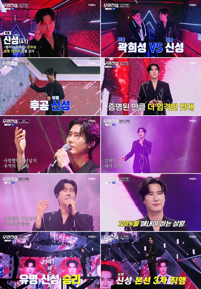 [메가경제=김지호 기자] 가수 신성이 MBN ‘무명전설’에서 ‘트로트 황태자’의 저력을 과시하며 1:1 데스매치에서 승리, 본선 3차전 진출을 확정지었다.