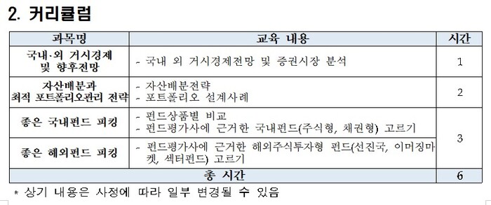 커리큘럼은 ▲국내외 거시경제전망 및 증권시장 향후 전망에 대한 분석 ▲자산배분전략 및 포트폴리오 설계 사례 ▲좋은 국내·해외펀드 피킹 등으로 구성됐다.