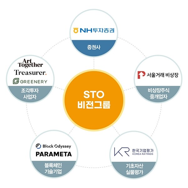 이번 ‘STO 비전그룹’에는 NH투자증권을 비롯한 ▲조각투자사업자 투게더아트(미술품), 트레져러 (명품·수집품), 그리너리(ESG탄소배출권) ▲비상장주식중개업자 서울거래비상장 ▲블록체인 기술기업 블록오디세이, 파라메타(구(舊)아이콘루프) ▲기초자산 실물평가사 한국기업평가 등 각 영역별 대표기업 8개사가 참여했다.