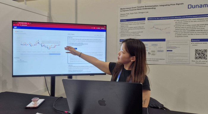 박희수 두나무 머신러닝팀 연구원은 AAAI 데모트랙에서 ‘시장 반응형 이벤트 타임라인 요약: 가격 신호 통합을 통한 금융 뉴스 이해도 향상’ 논문을 발표하고, 두나무가 자체 개발한 시스템을 직접 시연했다.