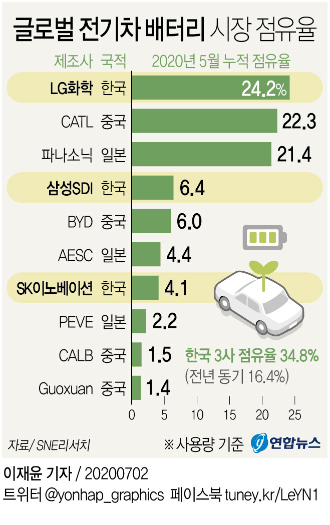 앞서 LG화학은 올해 1∼7월 세계 전기차 배터리 사용량 순위(SNE리서치)에서 25.1%를 차지하며 1위를 기록했다.