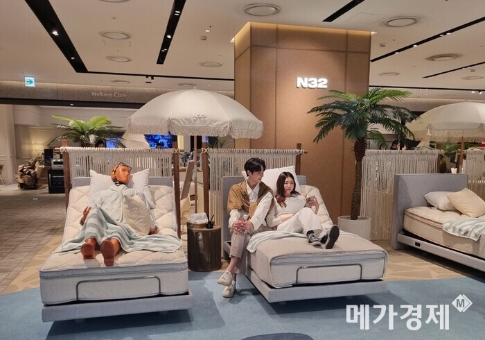 10일 시몬스에 따르면 '프리미엄 폼 매트리스 N32 팝업스토어'가 더현대 서울에서 전날부터 운영을 시작했다. 파라솔과 가림막을 배치해 고급 리조트 분위기를 연출한 매장에는 곳곳마다 모션베드가 놓였다. 쇼핑을 하다 잠시 발걸음을 멈춘 방문객들은 침대에 몸을 기대거나 직접 누워보며 피로를 풀었다.