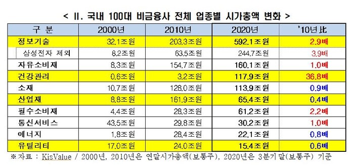또 내수 의존도가 높은 공기업 중심의 유틸리티는 기업 수(2개)도 가장 적고 시가총액(15.4조원)도 2000년와 2010년 말과 비교해 감소한 것으로 나타났다.