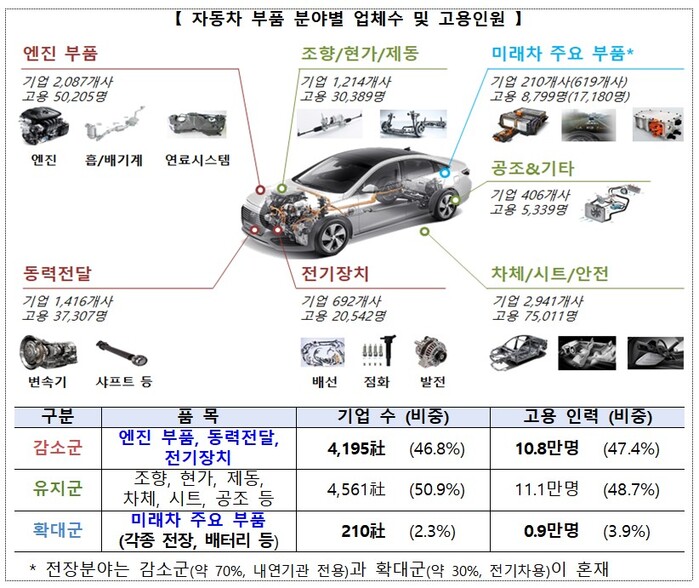 산업변화에 따라 국내 부품기업과 고용의 약 47%가 사업재편 필요 분야에 해당한다.