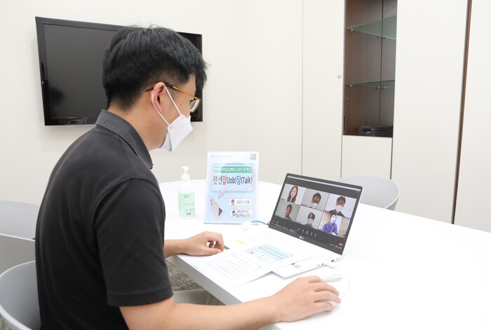 ▲ 비대면 멘토링 ‘랜선잡담’ 멘토로 나선 현대엔지니어링 임직원이 화상회의 프로그램을 사용해 청년들과 직무, 진로 상담을 진행하고 있다. [사진= 현대엔지니어링] |