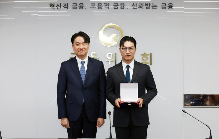 | ▲ ‘2025년 상반기 금융회사 STR(의심거래보고) 우수보고자 시상식’이 11일 정부서울청사에서 열렸다. (왼쪽부터) 이형주 금융정보분석원장, 모인 박종완 매니저 |