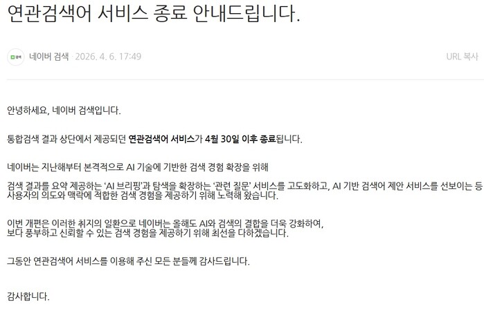 ▲네이버가 검색 블로그에 게시한 '연관검색어' 서비스 종료 안내문. [사진=네이버 블로그 캡쳐]