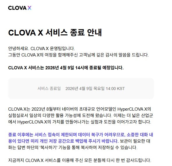 ▲클로바X 이용자 메일로 고지된 서비스 종료 안내문. [사진=네이버]