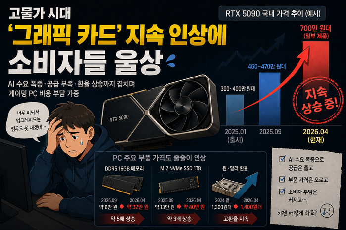 28일 업계에 따르면 지난해 1월 출시된 엔비디아 그래픽카드 'RTX 5090'의 가격이 현재 일부 제품 기준 700만원에 육박하고 있다. 출시 당시 300~400만원대였던 가격이 1년 만에 두 배 가까이 상승한 셈이다.