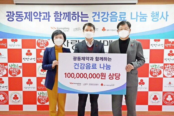 [메가경제=이석호 기자] 광동제약(대표 최성원)은 제주사회복지공동모금회(회장 김남식)와 함께 ‘광동제약과 함께하는 건강음료 나눔 행사’를 갖고 1억 원 상당의 음료를 후원했다고 18일 밝혔다.