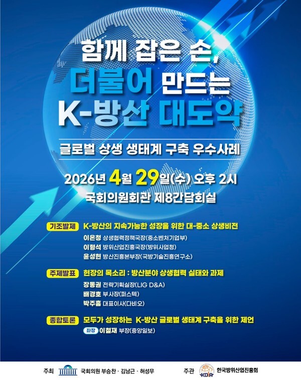 국회의원 김남근(정무위)·부승찬(국방위)·허성무(산자위) 의원실이 공동 주최, 한국방위산업진흥회가 주관하는 ‘K-방산 상생 생태계 구축을 위한 정책세미나’가 29일, 오후 2시 국회 제8간담회실에서 개최된다.