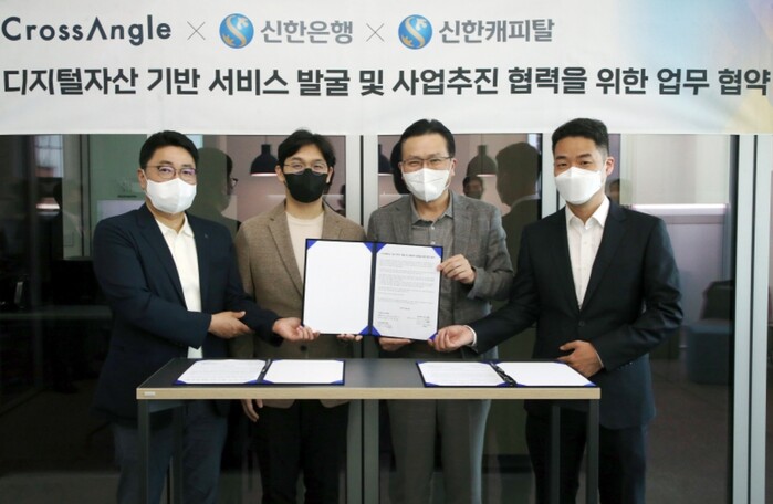 신한은행과 크로스앵글은 ▲양사 플랫폼 내 디지털자산 관련 서비스 개발 및 추진 ▲금융 및 디지털자산 데이터를 결합한 신서비스 개발 ▲혁신 기술을 갖춘 블록체인 기업 공동 발굴 및 사업추진에 상호 협력 등의 공동사업을 함께 진행해 나갈 예정이다.
