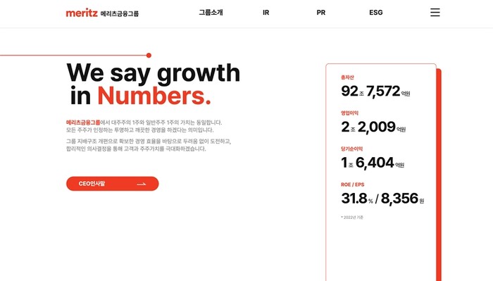 효과적인 정보 전달을 위해 홈페이지 디자인에도 변화를 줬다. 메리츠의 CI 색상인 ‘오렌지 레드’를 활용해 기업 아이덴티티가 강조되는 수치 및 시각 자료를 배치했다. 홈페이지를 접속할 시 처음 노출되는 메인 화면에서는 ‘We say growth in Numbers’라는 문구와 함께 메리츠금융지주 실적 수치를 한눈에 파악할 수 있도록 구성했다. ‘숫자로 성장을 보여주겠다’는 말은 대주주 1주와 일반주주 1주의 가치는 동일하다는 메리츠금융그룹의 원칙에 따라 ‘모든 주주가 인정하는 투명하고 깨끗한 경영을 하겠다’는 의미이다.