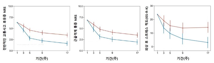 ▲ 황보경 한의사 연구팀 추적관찰 결과 한약 치료군과 대조군의 교통사고 후유증·근골격계 통증 NRS 및 사고 후 스트레스(IES-R-K) 지표가 감소하는 양상이 확인됐다. [자생한방병원 제공] |