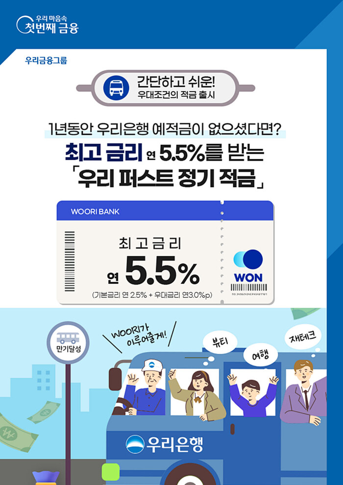 [메가경제=오민아 기자] 우리은행은 최고 연 5.5%의 금리를 제공하는‘우리 퍼스트 정기적금’을 출시한다고 17일 밝혔다.