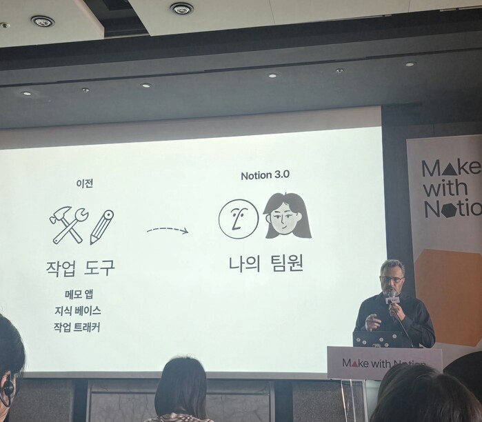 퍼지 코스로우샤히 최고기술책임자(CTO)는 노션 1.0부터 이어진 노션의 진화과정을 설명했다. 그는 “Notion 1.0은 문서와 지식 관리 시스템을 하나의 도구로 통합했고, 2.0은 이를 데이터베이스화해 프로젝트를 한곳에 모았다”며 “Notion 3.0은 이러한 데이터베이스에 노션 메일과 Notion 캘린더 및 슬랙, 깃허브, 세일즈포스 등 다양한 툴을 멀티 커넥터 플랫폼(MCP) 기반으로 연결해 에이전트가 사용자의 전체 업무 맥락을 이해하고 직접 업무를 완수할 수 있도록 했다”고 말했다.