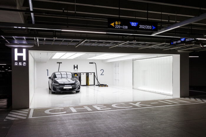 H 오토존은 차고와 같은 차량관리 공간이 없는 아파트의 단점을 보완하기 위해 단지 내 지하주차장 한켠에 셀프세차장보다 넓은 면적을 마련했다. 날씨와 시간에 구애받지 않고 언제든 편리하게 차량 내부를 정돈하고 간단한 정비 혹은 튜닝을 할 수 있다.