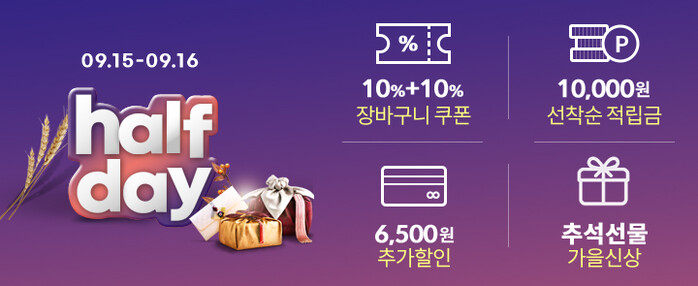 9월 하프데이 행사는 우리카드, 스마일페이, 페이코로 결제시 추가 할인 혜택을 제공한다. 우리카드로 5만원 이상 제품을 구매하면 3000원을 즉시 할인 해주고, 이벤트 기간 내 횟수 제한 없이 이용할 수 있다.
