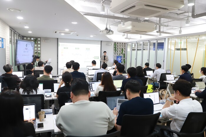▲지난 26일 IBK창공 구로센터에서 열린 IR행사에서 이윤노 ’주식회사 나누’ 대표가 투자를 위한 기업 설명을 진행하고 있다. [사진=IBK기업은행]