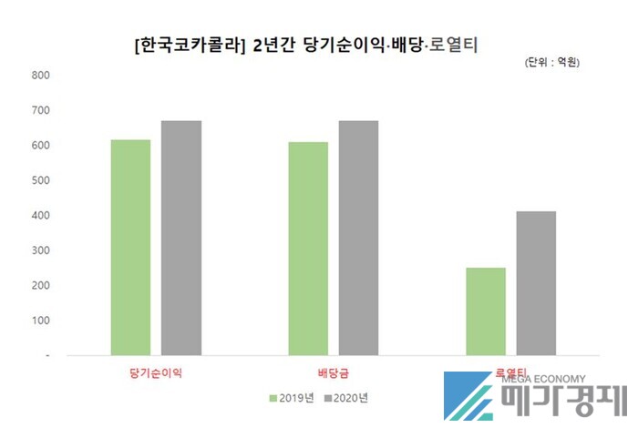 한국코카콜라의 지난해 배당금액은 670억 원으로 전년 대비 9.8% 증가했다. 배당성향은 100%가 넘어 지난해 거둔 당기순이익보다 소폭 많다. 배당률은 무려 5826%에 달한다. 한국코카콜라는 지난 2019년에도 610억 원을 배당했다. 당시 배당성향은 99.1%다.