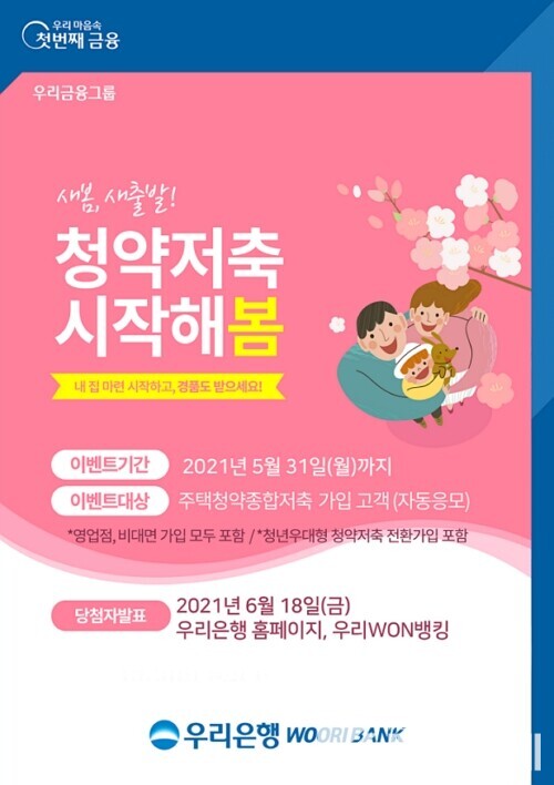 | ▲ 우리은행(은행장 권광석)은 2021년 새봄을 맞아 ‘새봄 새출발! 청약저축 가입해봄’ 이벤트를 5월 31일까지 실시한다. [사진=우리은행 제공] |