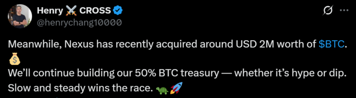 [메가경제=이상원 기자] 넥써쓰(NEXUS)가 최근 약 200만 달러(약 28억원) 규모의 비트코인을 매입했다.