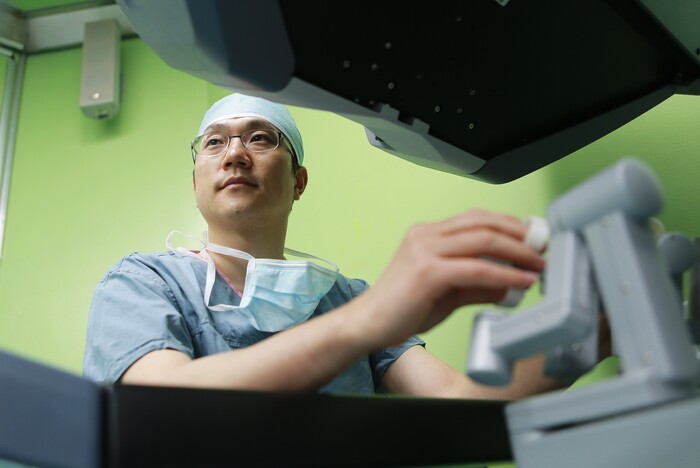 ▲고려대 안암병원 강석호 교수가 로봇 수술을 진행하고 있다[사진=고려대안암병원] |