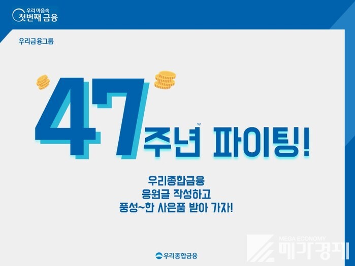 ▲ 우리종합금융(대표이사 김종득)이 창립 47주년을 기념해 ‘응원글 이벤트’를 실시한다. [그래픽=우리종합금융 제공] |