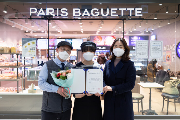 | ▲ 24일 파리바게뜨 고속터미널점에서 SPC행복한장학금 장학생으로 선발된 김윤정 학생(가운데) 가맹점 대표와 SPC행복한재단 관계자와 함께 기념촬영을 하고 있다. |