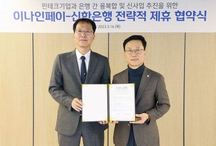신한은행(은행장 정상혁)은 ㈜이나인페이(대표 전혁구)와 신사업 추진 및 플랫폼 경쟁력 강화를 위한 전략적 업무협약을 체결했다고 17일 밝혔다.