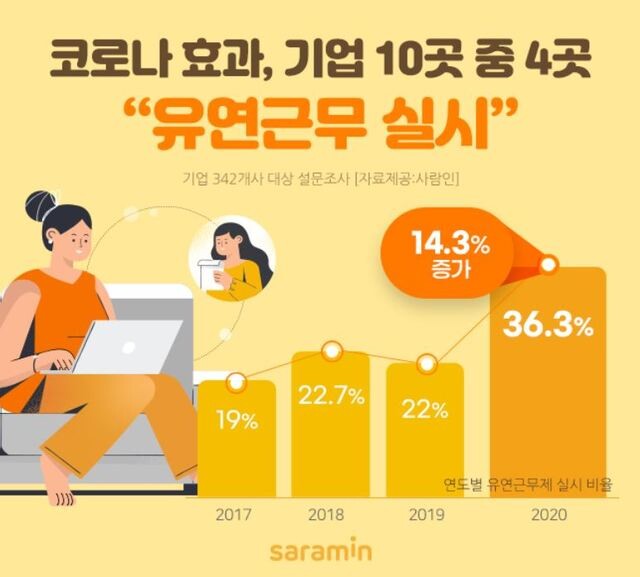 취업포털사이트 사람인이 342개 기업을 대상으로 ‘유연근무제 실시 현황’을 지난달 16일부터 20일까지 조사한 결과, 36.3%가 ‘시행하고 있다’고 24일 밝혔다. 이는 지난해 조사 결과(22%) 대비 14.3%p 증가했으며, 같은 조사를 시작한 2017년 이래 가장 높은 수치다.