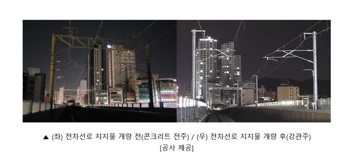 | ▲ (좌) 전차선로 지지물 개량 전(콘크리트 전주) / (우) 전차선로 지지물 개량 후(강관주) |