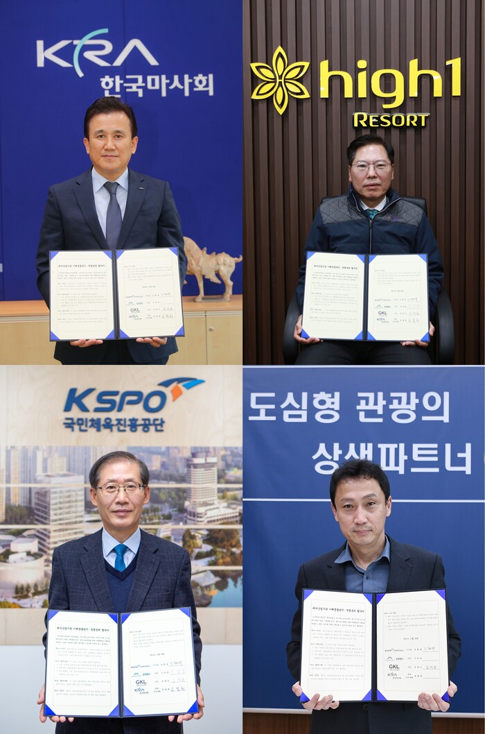 | ▲ (왼쪽 상단부터 시계방향) 한국마사회 송철희 회장 직무대행, 강원랜드 이삼걸 사장, 그랜드코리아레저 김영산 사장, 국민체육진흥공단 조현재 이사장 [사진=한국마사회 제공] |