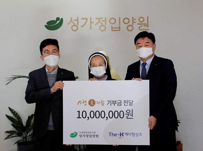 [메가경제=이석호 기자] The-K예다함상조(대표 오승찬, 이하 ’예다함’)가 지난 8일 성가정입양원에 ‘사랑[愛]다함’ 기부금 1000만 원을 기부했다고 9일 밝혔다.