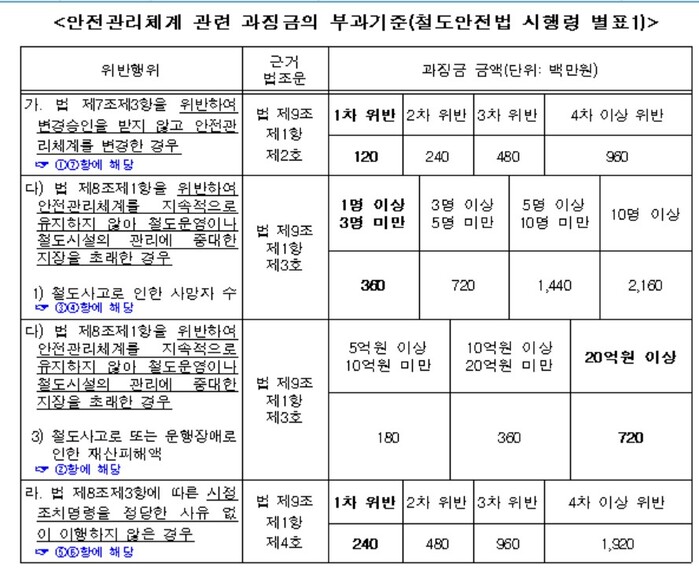 이외에 선로 내 작업 시 안전조치 미시행에 따른 시정조치 명령 불이행('22.12.23)으로 2억4천만원, 전차선로 유지관리대장 관리 부적정에 따른 시정조치 명령 불이행('22.1.20)으로 1억2천만원의 과징금이 부과됐다.